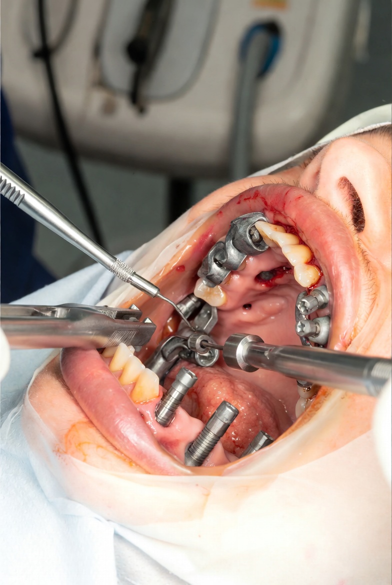 Treatment begins with a CBCT scan and digital implant planning session. On surgery day, failing teeth are extracted and 4–6 angled titanium posts are placed in the jaw bone under local anaesthesia or sedation. A temporary fixed bridge is attached to the implants the same afternoon. Over 3–6 months, bone fuses with the implants during the osseointegration period. The permanent full-arch zirconia or acrylic bridge then replaces the temporary restoration.