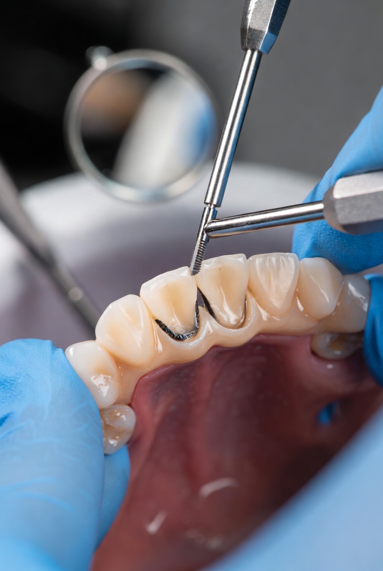 Use a floss threader or water flosser to clean beneath the false tooth. Regular cleaning prevents decay around and under the bridge.